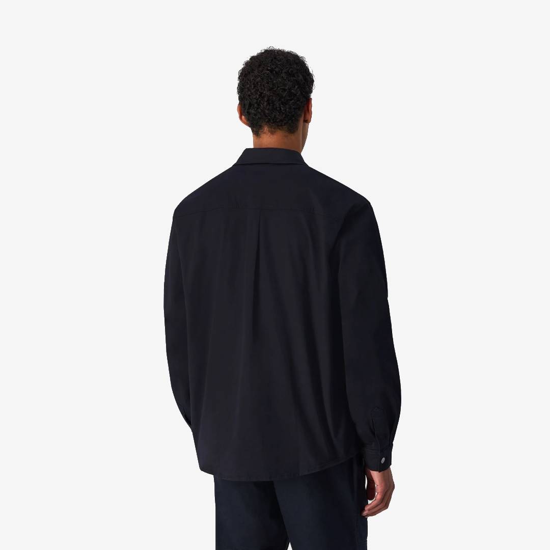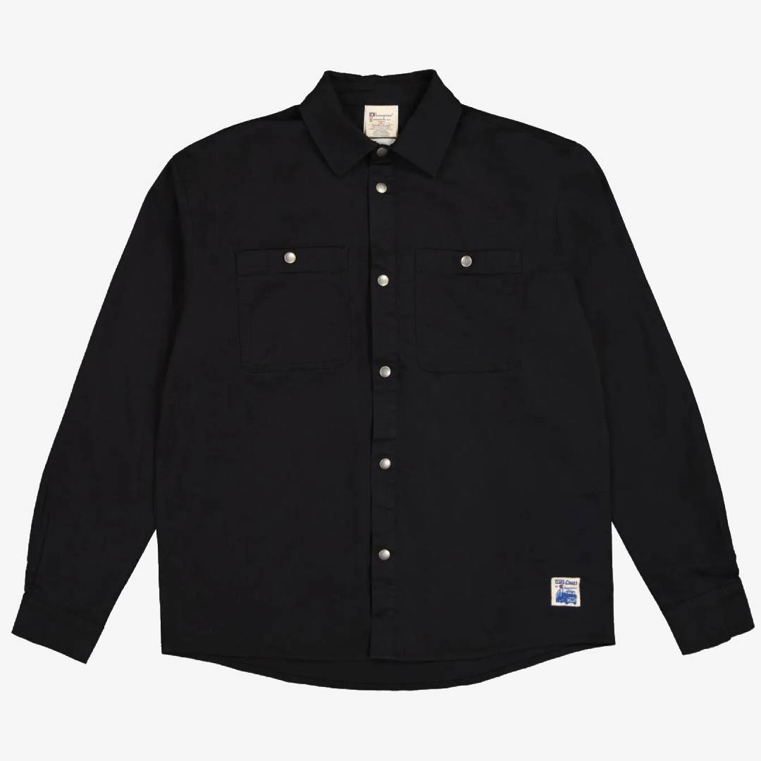 Dieses normal geschnittene Herrenhemd aus Stretch-Baumwolle verfügt über eine Vintage-Waschung und einen Druckknopfverschluss.