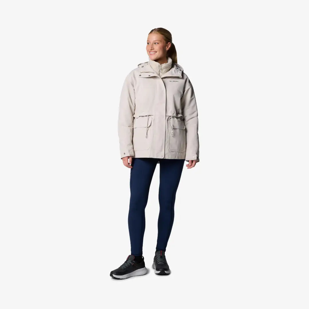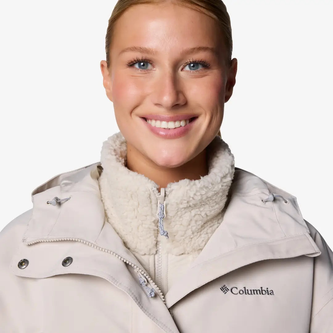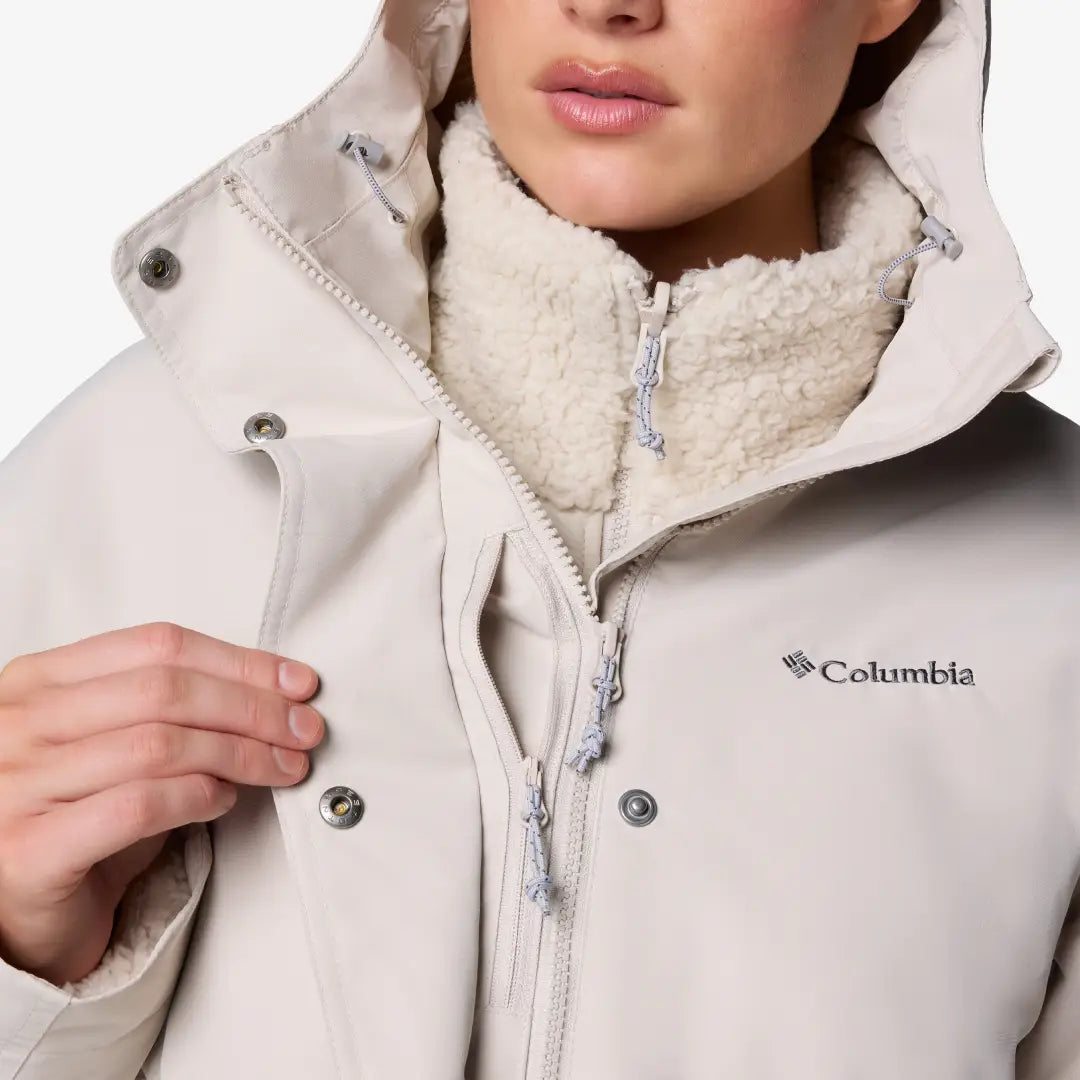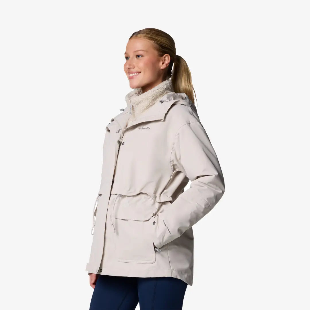 Die Kapuzenjacke Columbia Der Drop Ridge II Interchange für Damen ist ein cleveres 3-in-1-Modell, das optimale Vielseitigkeit bietet. Die Kapuze schützt dich dank wärmereflektierender Technologie vor den Elementen und verfügt über praktische Taschen und verstellbare Details an Taille, Bündchen und Saum für eine individuelle Passform.