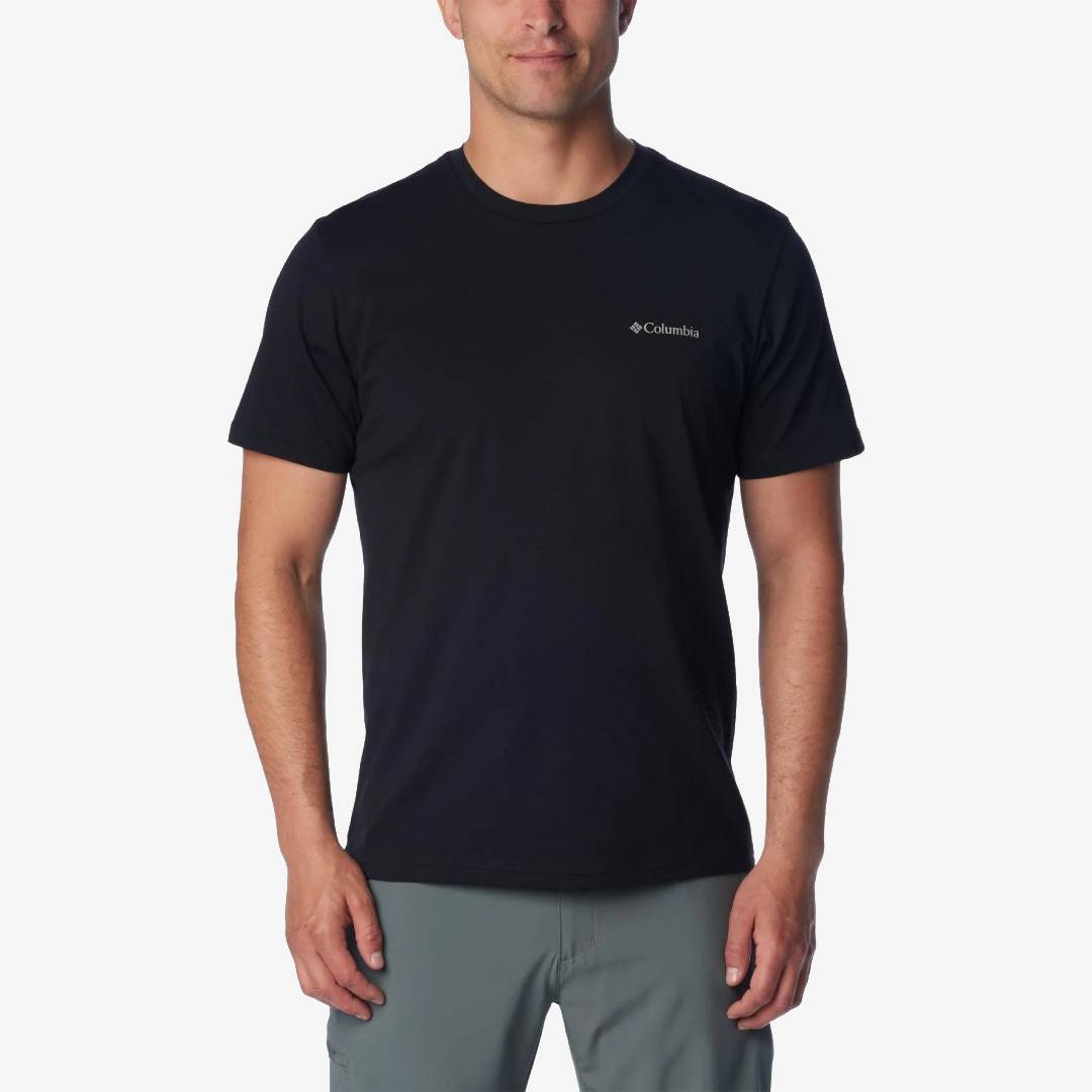 Ein klassisches T-Shirt mit Rundhalsausschnitt und Logos auf der Brust und dem Rücken.