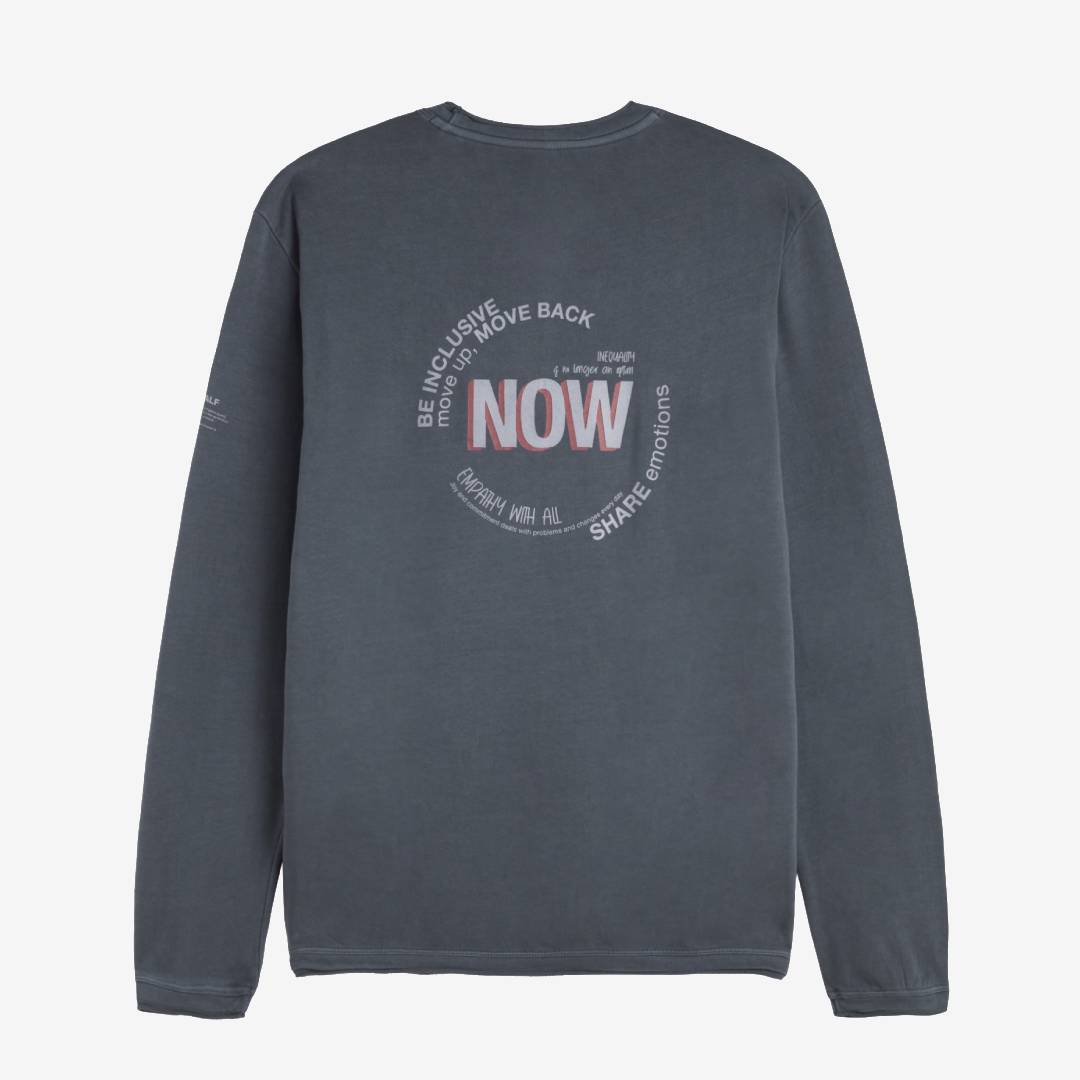 Das Now Langarm-T-Shirt hat einen Aufdruck auf der Rückseite und besteht zu 50 % aus recycelter Baumwolle und zu 50 % aus Bio-Baumwolle, nachhaltigere und umweltfreundlichere Alternativen im Vergleich zu herkömmlicher Baumwolle. Ein T-Shirt, mit dem Sie die Kreislaufwirtschaft fördern.