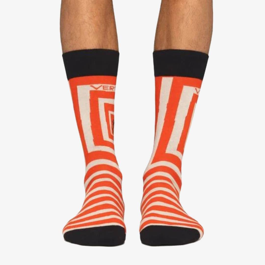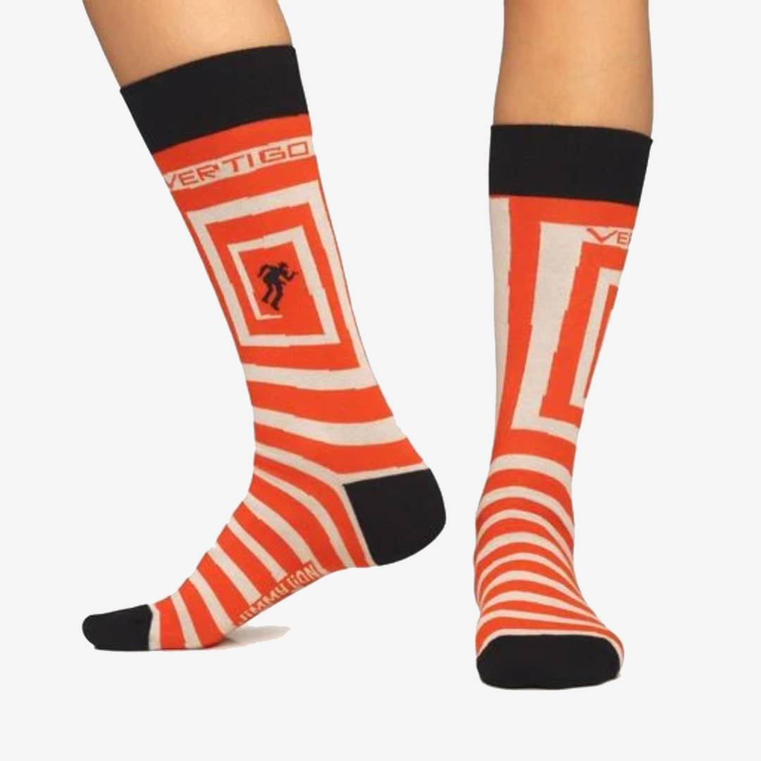 Mit diesen auffälligen und originellen Socken bleiben Sie nie unbemerkt. Sie können Vertigo™, den meisterhaften Film von Alfred Hitchcock, noch einmal erleben und das Plakat zur Ankündigung seiner Veröffentlichung genießen ... an Ihren Füßen! Das Farbspiel Orange und Beige in Spiralform umspielt Ihre Beine und zieht alle Blicke auf sich. Darüber hinaus werden Sie auf absolut unwiderstehliche Weise in eine Welt voller Intrigen, Geheimnisse und Spannung eintauchen. Kombinieren Sie sie nach Belieben und... zeigen Sie Ihren furchteinflößenden Look!