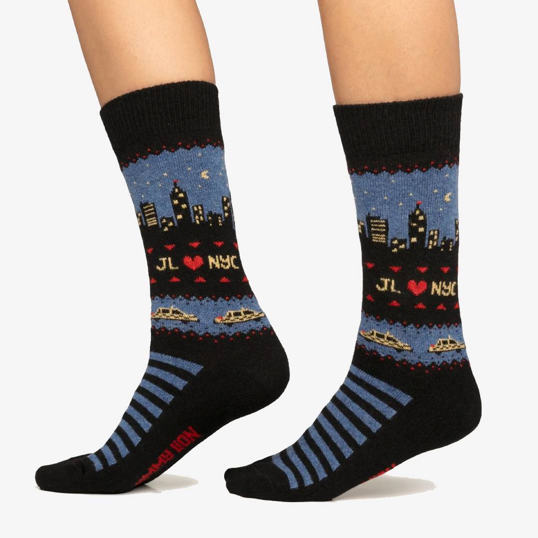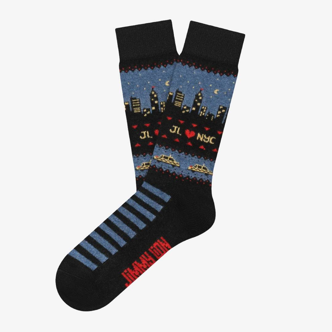 Willkommen in der Stadt, die niemals schläft! Genießen Sie die New Yorker Nacht auf ganz besondere Weise dank der Skyline des unwiderstehlichen Aufdrucks dieser weichen und warmen Socken. Die Taxis werden um Ihre Knöchel herumgeführt und verleihen Ihrem Look eine sehr originelle Note. Außerdem werden Sie den Kontrast mit der Unterseite voller blauer und schwarzer Querstreifen lieben. Wenn Sie New York lieben und es lieben, die neueste Mode zu tragen, ohne zu frieren, werden diese Woll- und Kaschmirsocken diesen Winter zu einem Must-have in Ihrer Garderobe!