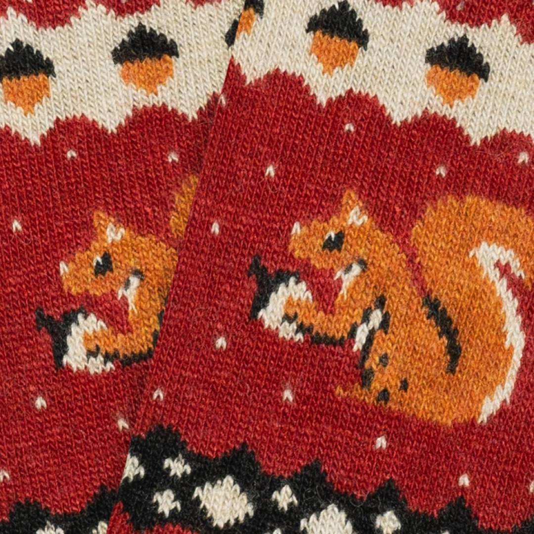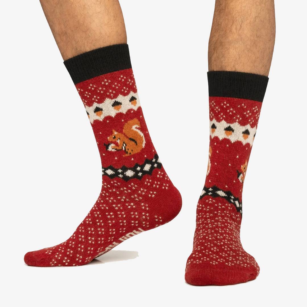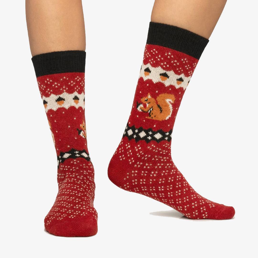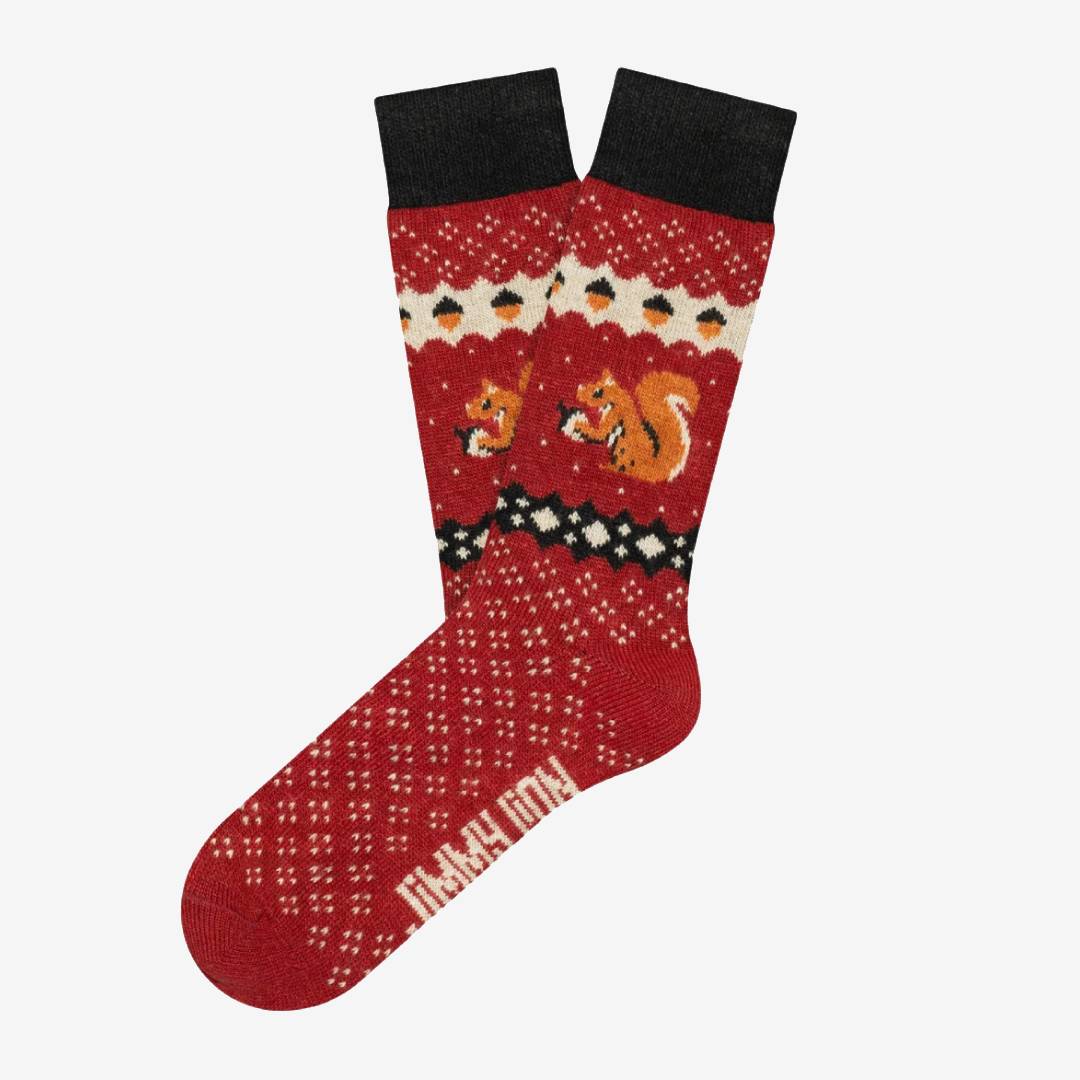 Die legendären Eichhörnchen, die frei durch den Central Park streifen, schleichen sich diesen Winter an Ihre Füße und verleihen Ihrem Alltag eine lustige Note. Sie sind die unbestrittenen Besitzer des berühmtesten Parks in New York und nun auch aller Ihrer Looks. Sie werden es lieben, den Komfort und die Weichheit zu spüren, die Ihnen die originellsten und unwiderstehlichsten Socken der Saison bieten. Darüber hinaus machen sie der Streifen mit Eicheln am oberen Rand des Designs und die intensive rote Farbe des Hintergrunds einzigartig. Aus Wolle und Kaschmir gefertigt, werden sie die wärmsten in Ihrem Kleiderschrank sein!