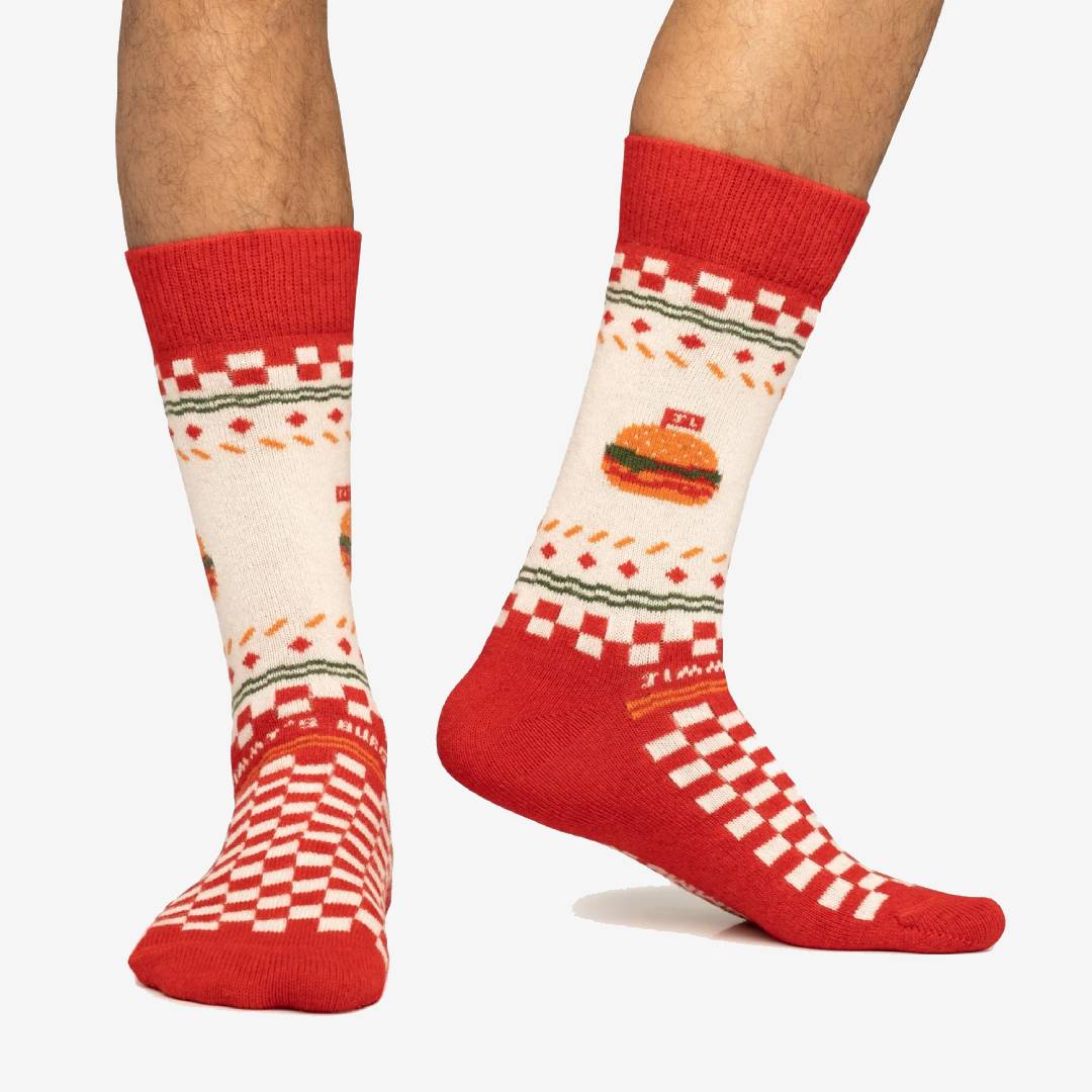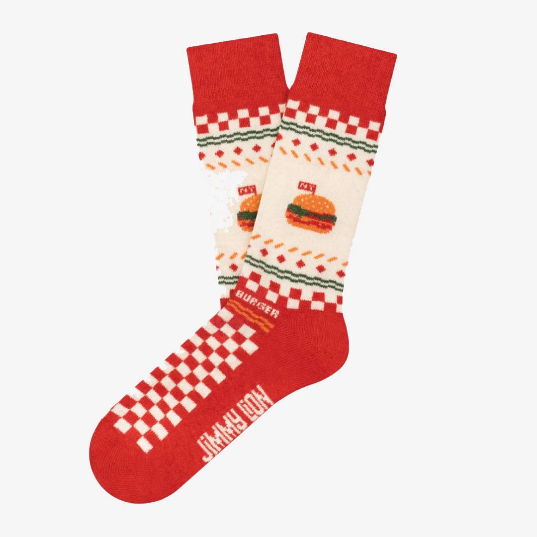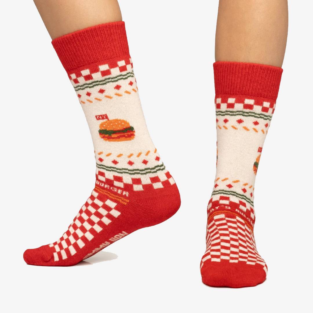 Do not miss the most irresistible wool and cashmere socks of the winter season. And not only because they are the warmest and softest that you will have in your closet, but because they have a print that will awaken all your senses. Recalling the typical fast food of the big American cities, this design with a hamburger on a checkered tablecloth will be the most envied thing in your day to day. The details in green and the print with red and white squares at the bottom of the design make it unique and very special. Say hello to the cold with the most original socks!