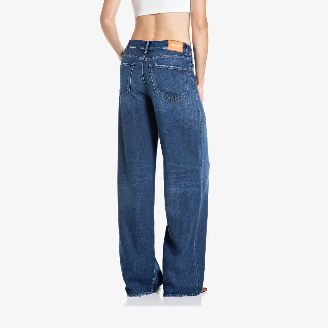 Wide-leg jeans with a mid-rise waist and wide leg for a comfortable, relaxed fit. The five-pocket style is crafted from 12.5 oz cotton-lyocell indigo denim with a super-soft feel and features a stonewashed finish in a dark wash. These women's jeans also feature contrasting distressed areas, including rips, whiskering, and hand-finished sanding. The garment is finished with the iconic embroidered "R" on one of the back pockets and a small logo insert on one of the front pockets. Button and zip fly.