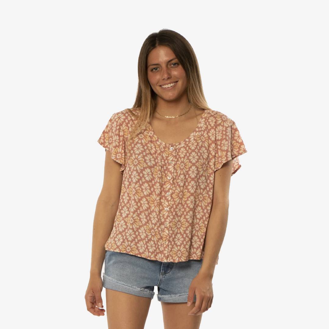 Feel the charge of Electric Love, our premium short-sleeved tee woven in a soft, printed eco-viscose crinkle fabric. This garment features a button-front placket and a neckband.
