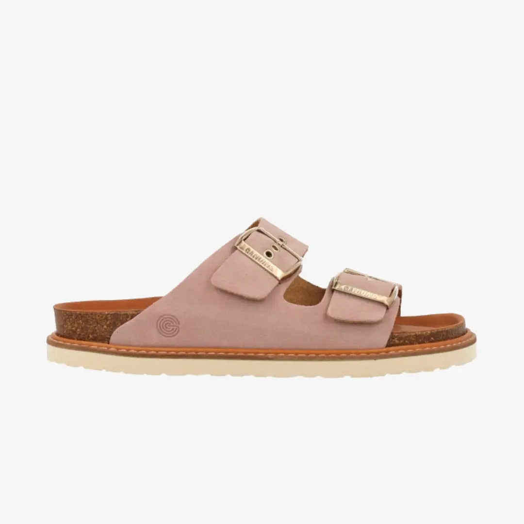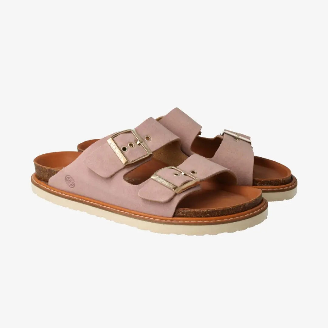 Sandale en cuir rose avec semelle anatomique et brides à boucles réglables. Cuir certifié par les fournisseurs du Leather Working Group (LWG) avec le statut or.