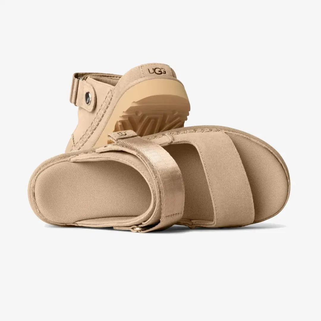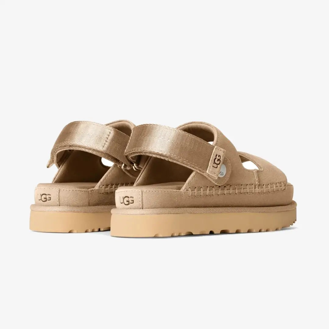 sandales pour femmes UGG Goldenstar Glide est une combinaison d'élégance, de confort et de respect de l'environnement. La tige est en daim de haute qualité pour plus de durabilité et un look élégant. Une sangle de talon réglable avec fermeture auto-agrippante permet un ajustement personnalisé, tandis que la possibilité de déplacer la sangle vers l'avant transforme la sandale en tong pour une utilisation polyvalente. La semelle intérieure profilée, doublée d'un matériau recyclé doux et enrichie d'un revêtement antibactérien à base de menthe, assure une fraîcheur toute la journée. La semelle intermédiaire et la semelle extérieure en mousse EVA à base de canne à sucre et de matériaux recyclés soulignent l'engagement de la marque en matière de protection de l'environnement.