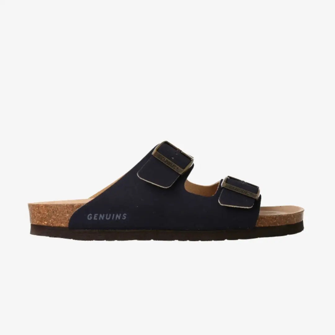 Sandalo in pelle oliata nera con suola anatomica e cinturini con fibbie regolabili. Pelle certificata dai fornitori del Leather Working Group (LWG) con status Gold.