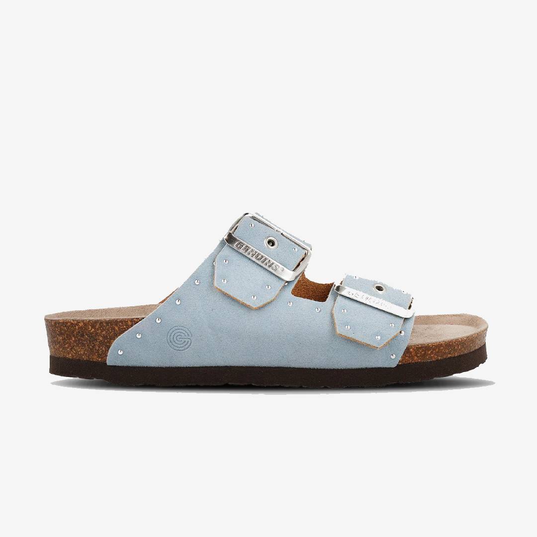Sandalo in pelle celeste con borchie e fibbie regolabili. Suola anatomica in sughero e schiuma. Pelle certificata dai fornitori Leather Working Group (LWG) con status Gold.