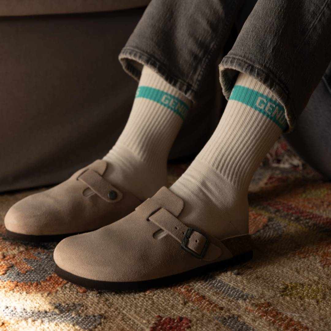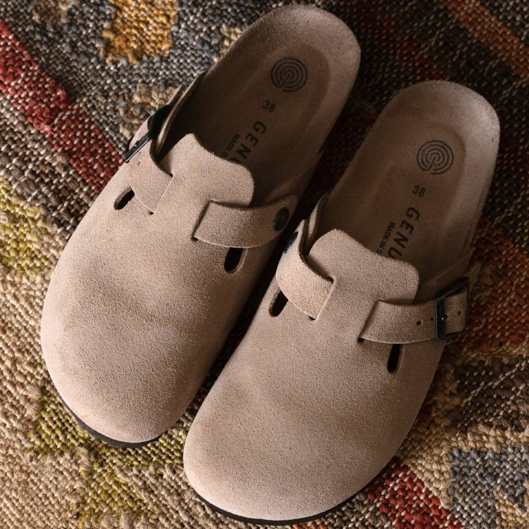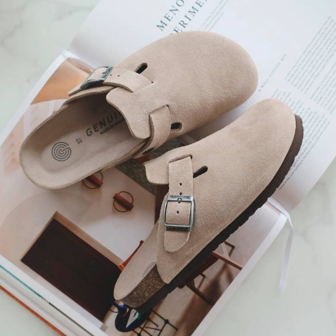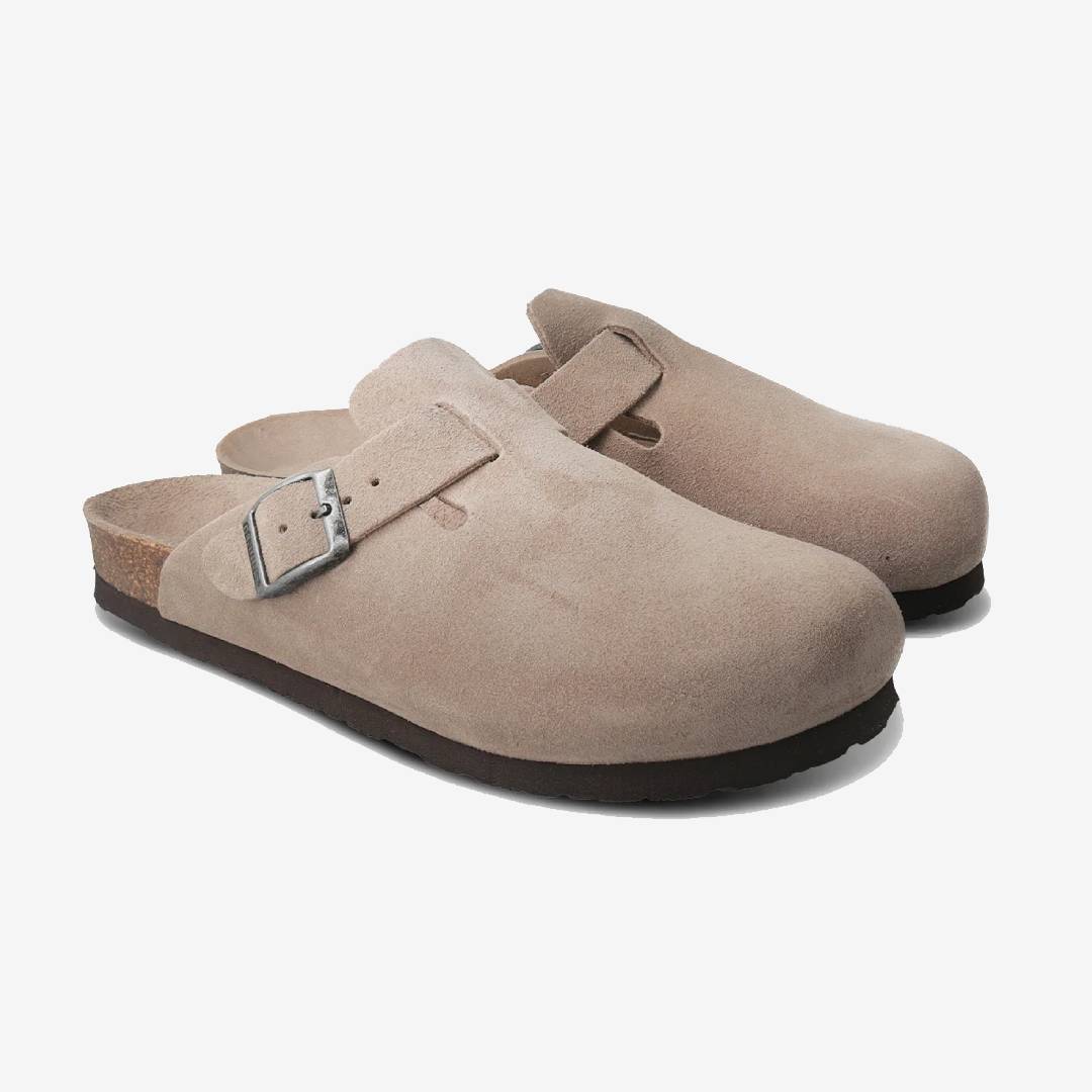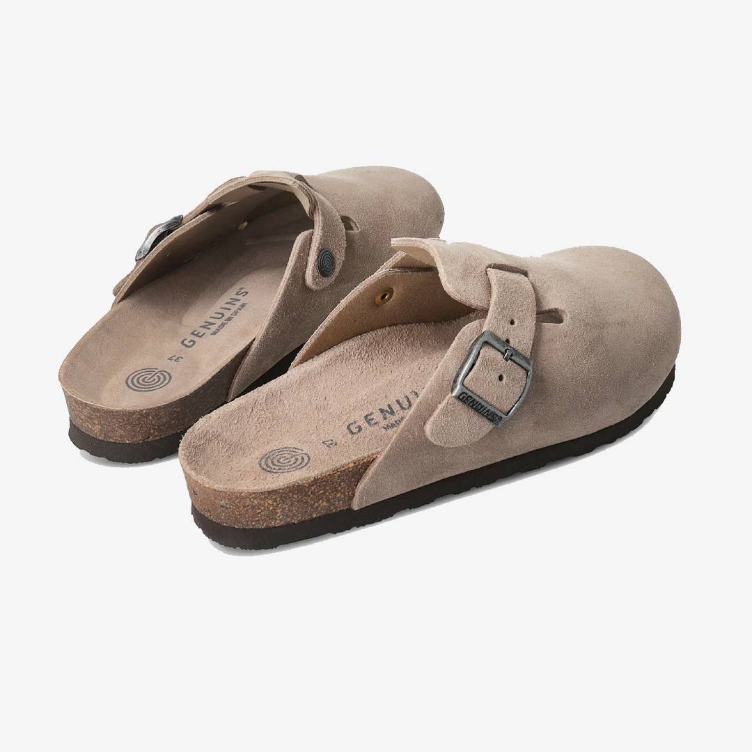 Zoccolo in pelle scamosciata grigio talpa con plantare anatomico Genuins e fibbia regolabile. Pelle certificata dai fornitori Leather Working Group (LWG) con status Gold.
