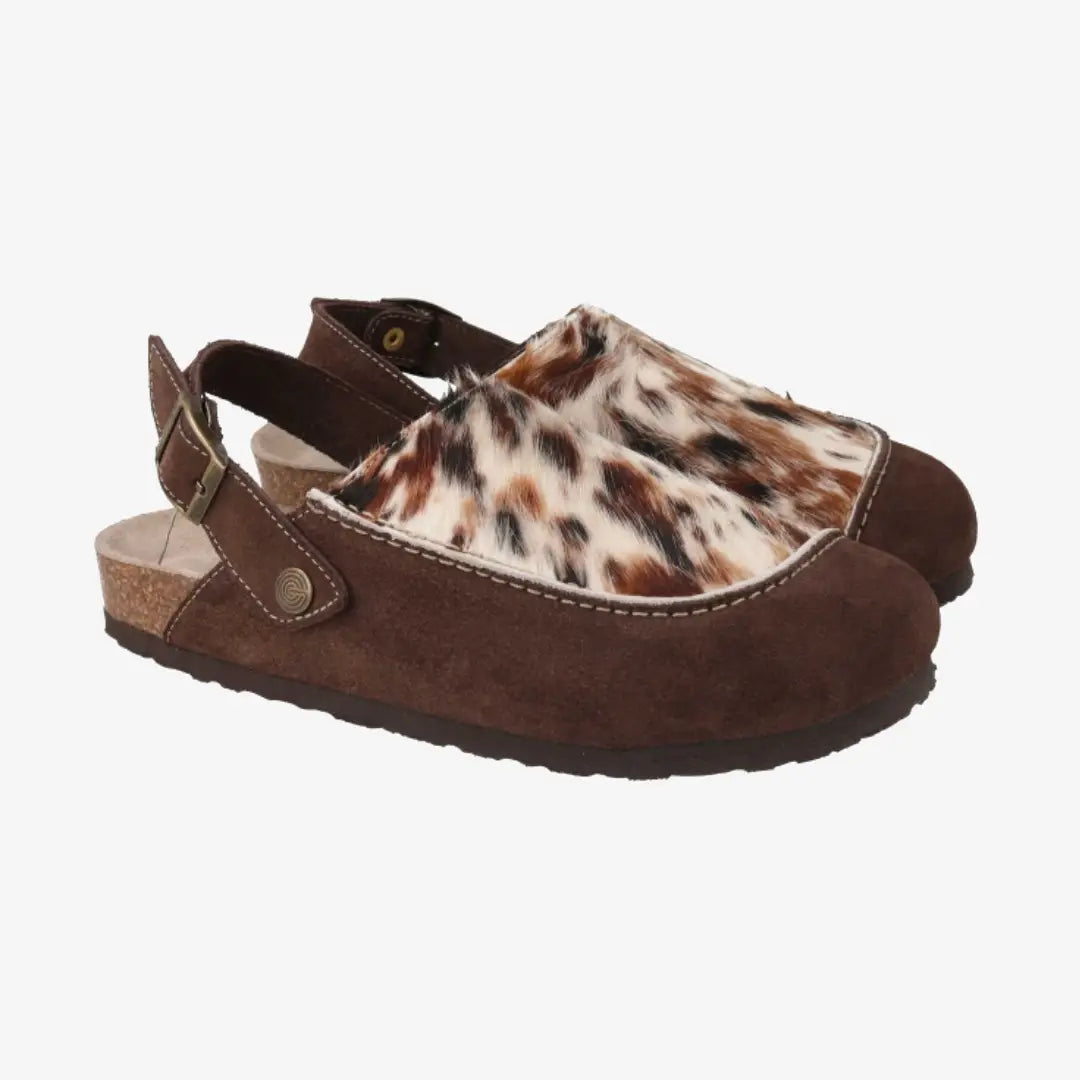 Zueco de piel combinado en serraje y pelo estampado animal con planta anatómica y hebilla ajustable al tobillo. Piel certificada por proveedores del Leather Working Group (LWG) con estatus oro.