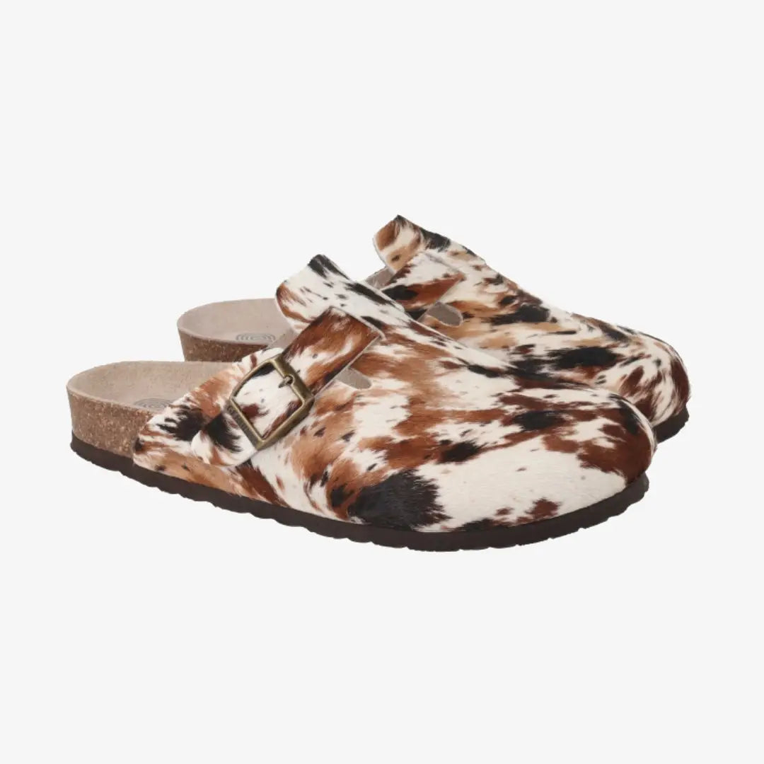 Zueco de piel estampado animal con planta anatómica y hebilla ajustable. La piel, certificada por proveedores del Leather Working Group (LWG) con estatus oro, presenta un suave pelito al tacto que realza su textura natural.