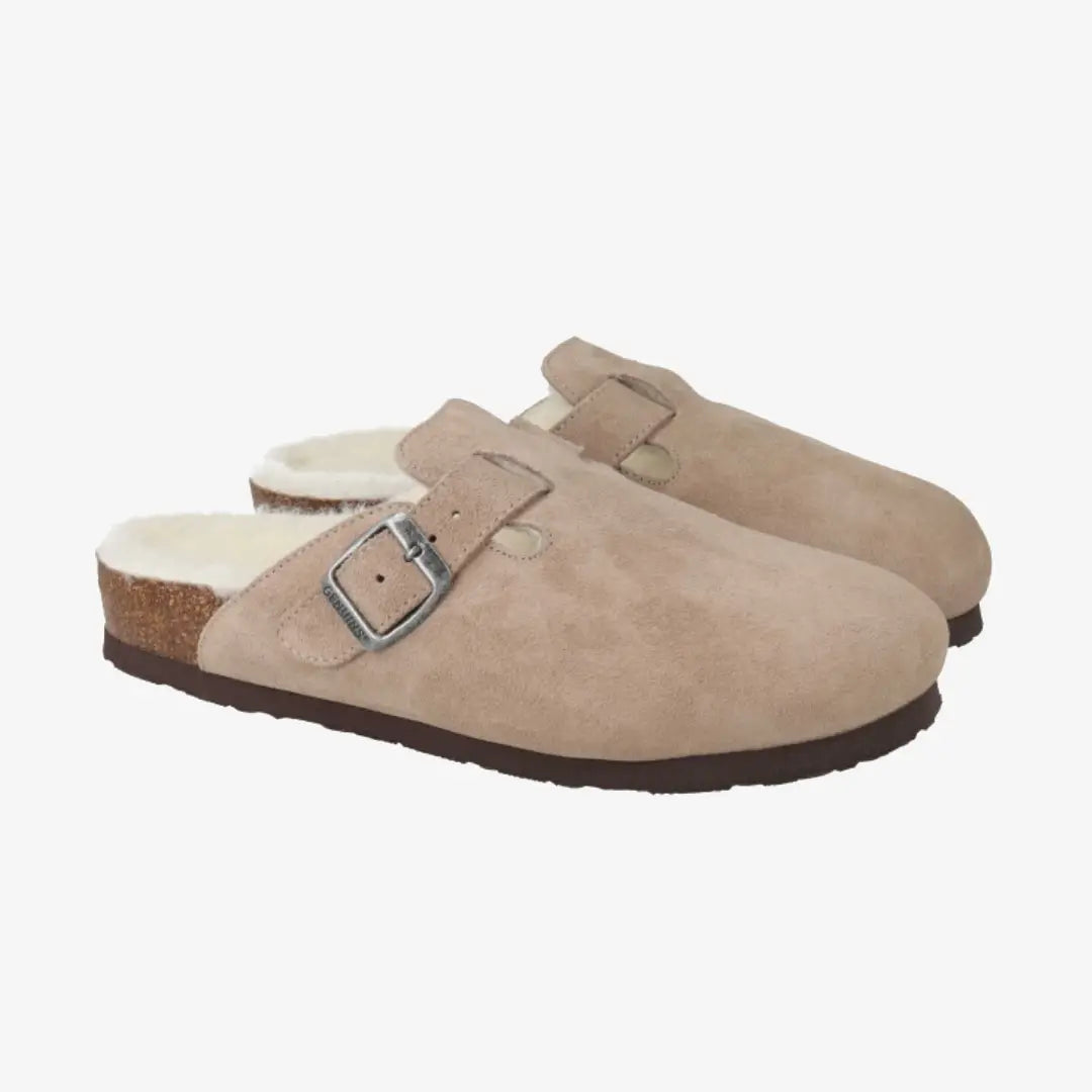 Zueco de piel serraje forrada en lana y hebilla ajustable.
