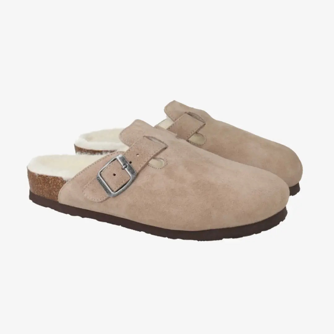 Zueco de piel serraje forrada en lana y hebilla ajustable.