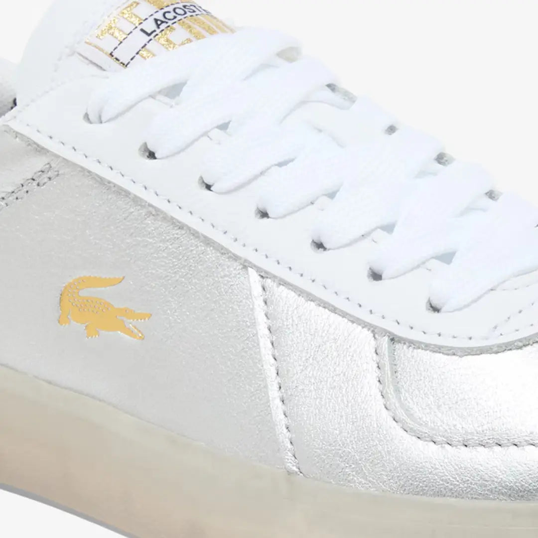 Una versión más audaz de la clásica Baseshot Pro de Lacoste. Combina una parte superior de piel sintética metálica con paneles en contraste y detalles exclusivos clásicos en tono dorado, como un cocodrilo central en bajorrelieve. Un diseño atrevido con una suela semitranslúcida
